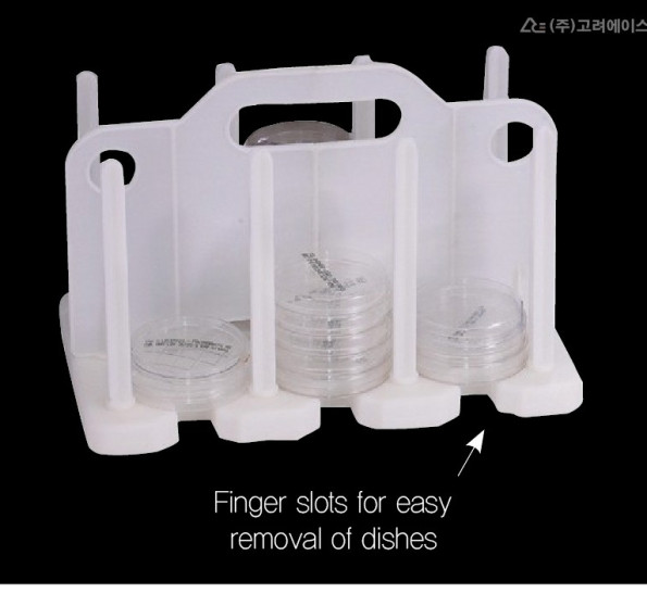 표준 페트리 접시를 여러 장 정리·보관·건조할 수 있도록 설계된 실험실 랙입니다.